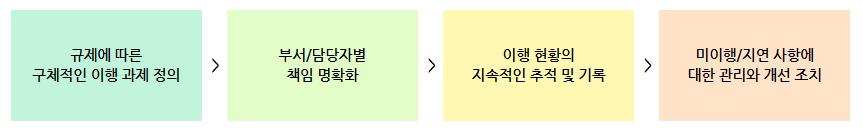 기업에 대한 법령, 규제는 지속적으로 개정되거나 추가됩니다. 문제는 규제 변경사항이 실제 내부 업무의 이행으로 연결되지 못한다는 것입니다. 따라서 효과적인 이행 관리를 위해서는 법령 및 가이드라인 변경사항 등이 내부 규정과 연결되고, 다시 구체적인 이행 과제 단위로 전환되는 프로세스가 필요합니다.